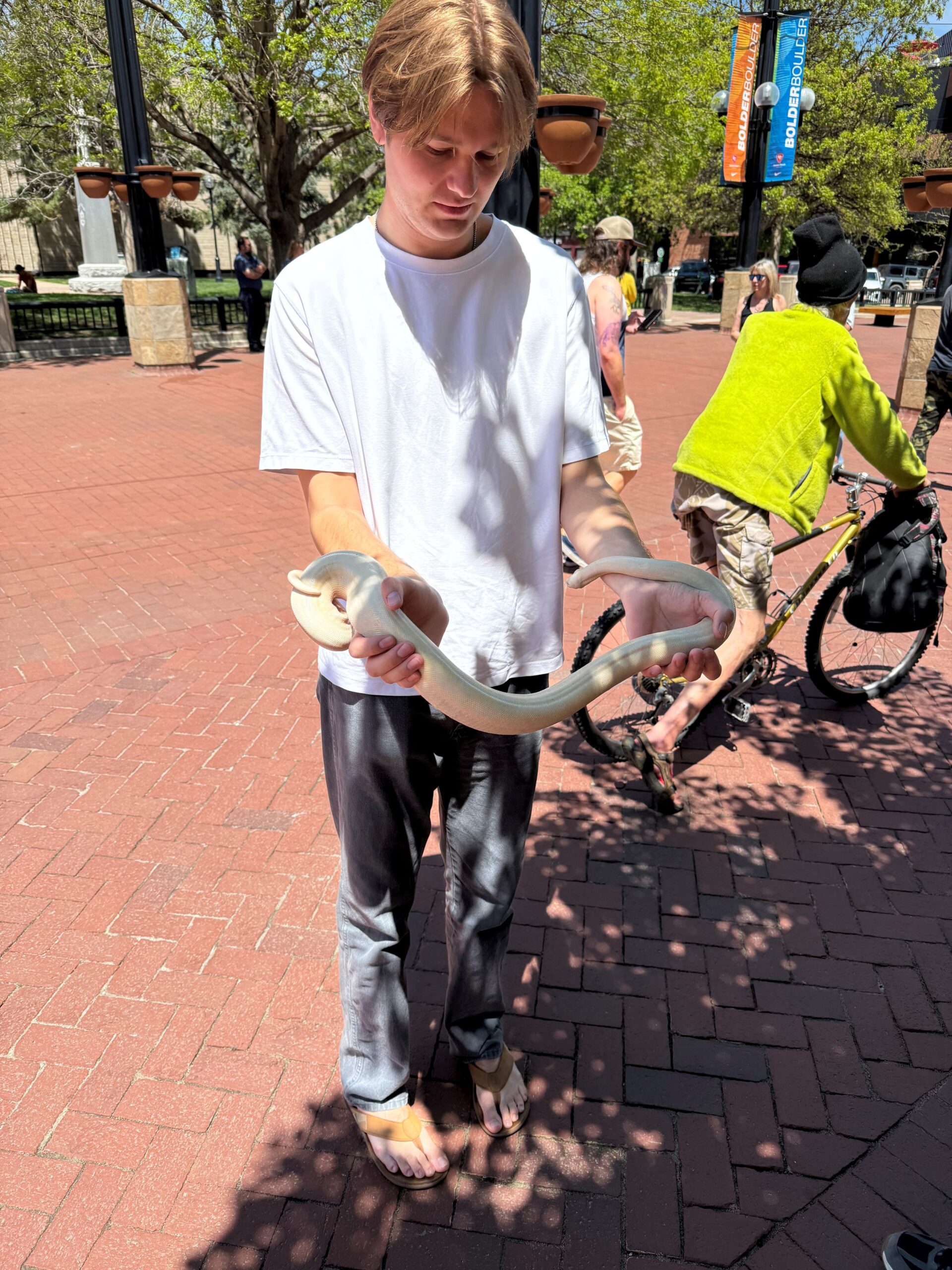 Yesterday we were up early, hit the hotel gym, (they’re never good) and then went for a walk. Around noon we checked out and went to Ava’s where we parked the truck for the rest of the day. Jag, Lori and I then went to the mall and walked around and grabbed a quick bite to eat. We didn’t want to eat too much as we had dinner 3 hours later. Pearl Street Mall is closed to traffic and is full of restaurants, bars, shops, street musicians and lots of people. Below you’ll see a pic of Jag holding a white boa constrictor!