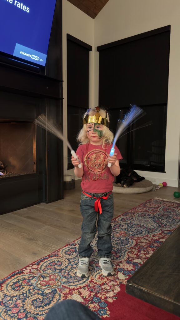 Here’s Wes, his dad forgot his belt so River tied a ribbon around his pants and he got his face painted at the Valentines Day party. He’s a Minecraft dinosaur! He’s too funny and said to Lori when she commented on it, “how do you know about Minecraft”! Check out his Def Leppard t-shirt!