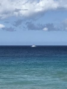 When we walked down to the beach, we saw some whales frolicking in the water jumping straight up and making huge splashes. An employee of the Ritz said it was a baby one and there’s tons of whales out there right now which is good as we go out on a Zodiac boat that holds 12 people whale watching, I think on Wednesday. Lori tried to get a picture but only caught the splash, see below.