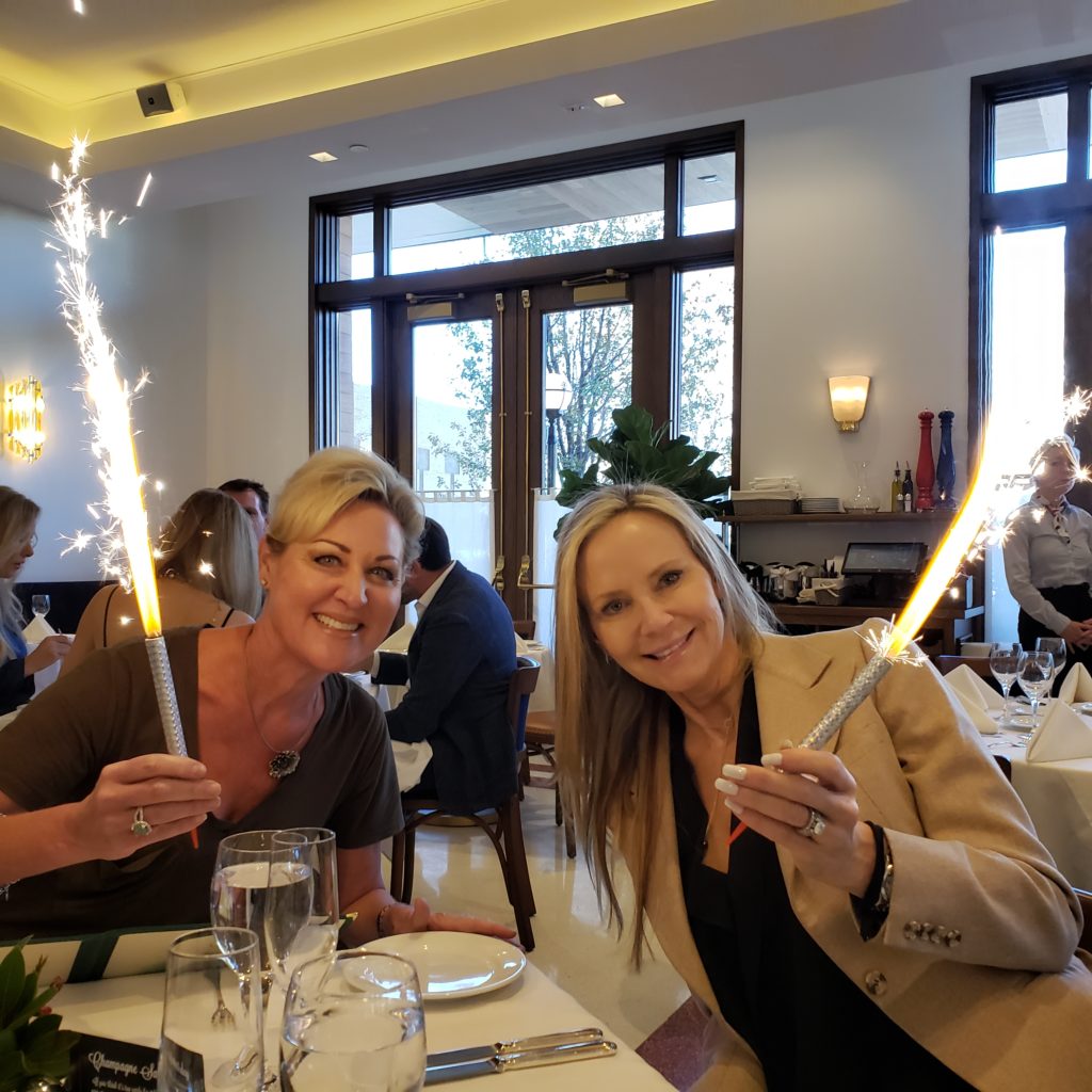 That’s it, time to get moving. Here’s a picture of some fireworks they bring you at the new French restaurant we went to for lunch when you order champagne! Lori always looks fabulous, and loves wearing Mom’s jacket! Have a great day and God Bless.