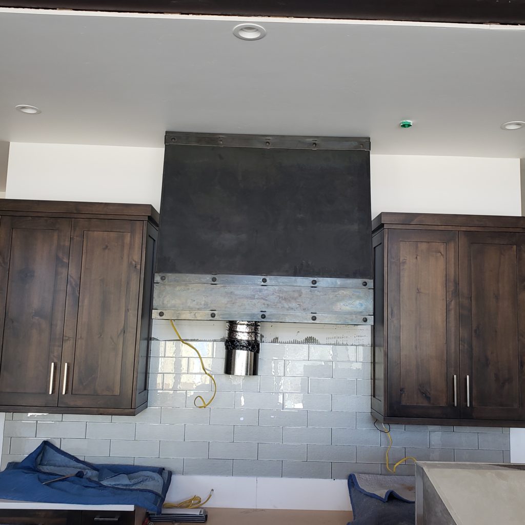 Today after the gym we’ll probably clean up a bit around here before heading down to the house so Lori can see the progress. Below is a picture of our oven hood. You can also see the cabinets and Lori’s backsplash! The house sure is going to be nice.