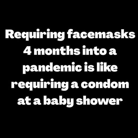 I saw this yesterday, funny. Being serious though, I get the face mask thing. I don’t agree that it can be legally mandated but we wear them. The best thing would be limiting all the travel from State to State. Now across the Country people are wearing mesh face masks in protest which fulfill the requirement to wear one but don’t do much else. Oh well.