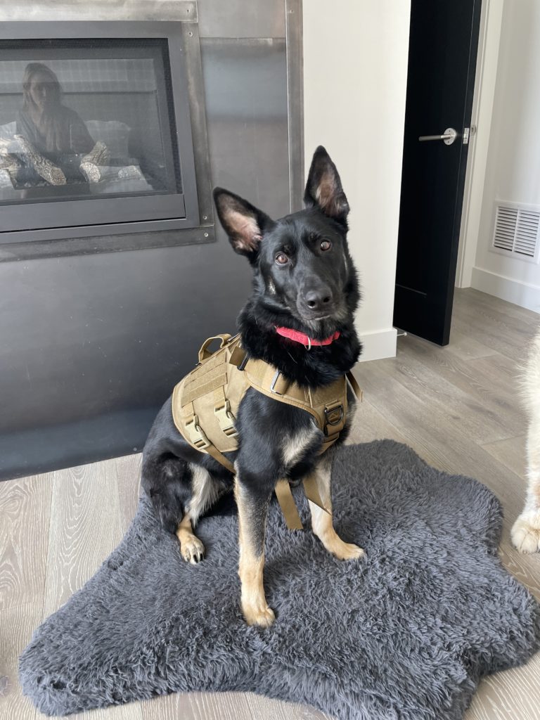 Time to go. Here’s Harley in her new vest! She’s pretty tough and looks like a military dog, which she basically is. Nobody wants to mess with her, ha. She can literally jump over a six foot fence among other things. Both dogs had a lot of play time yesterday. You think they’d be tired but no, they just keep on going. Be well, GB.