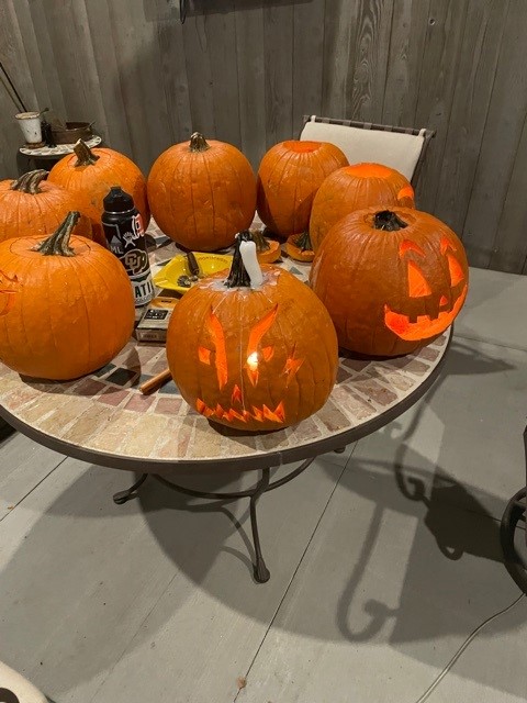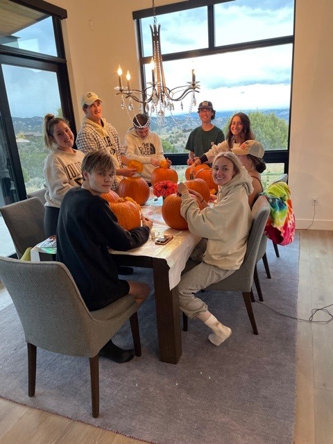 We brought Dixie up on our way home from our Costco stop and she hung out with us until around 7. All the kids carved pumpkins and Dixie was mesmerized and wanted to be part of the fun. She had a blast and the girls in particular spent a lot of time talking with her. They’re a good group of kids. Finally after dinner they went into the garage and played some drinking game. Ty showed up around 9:30 or so. They’re all sleeping now.