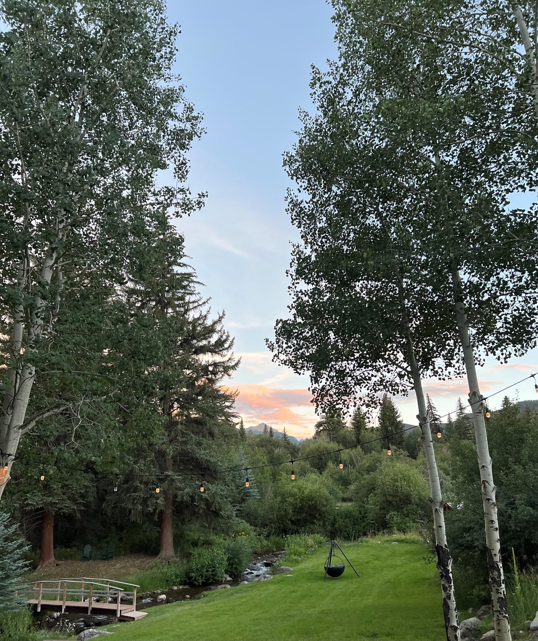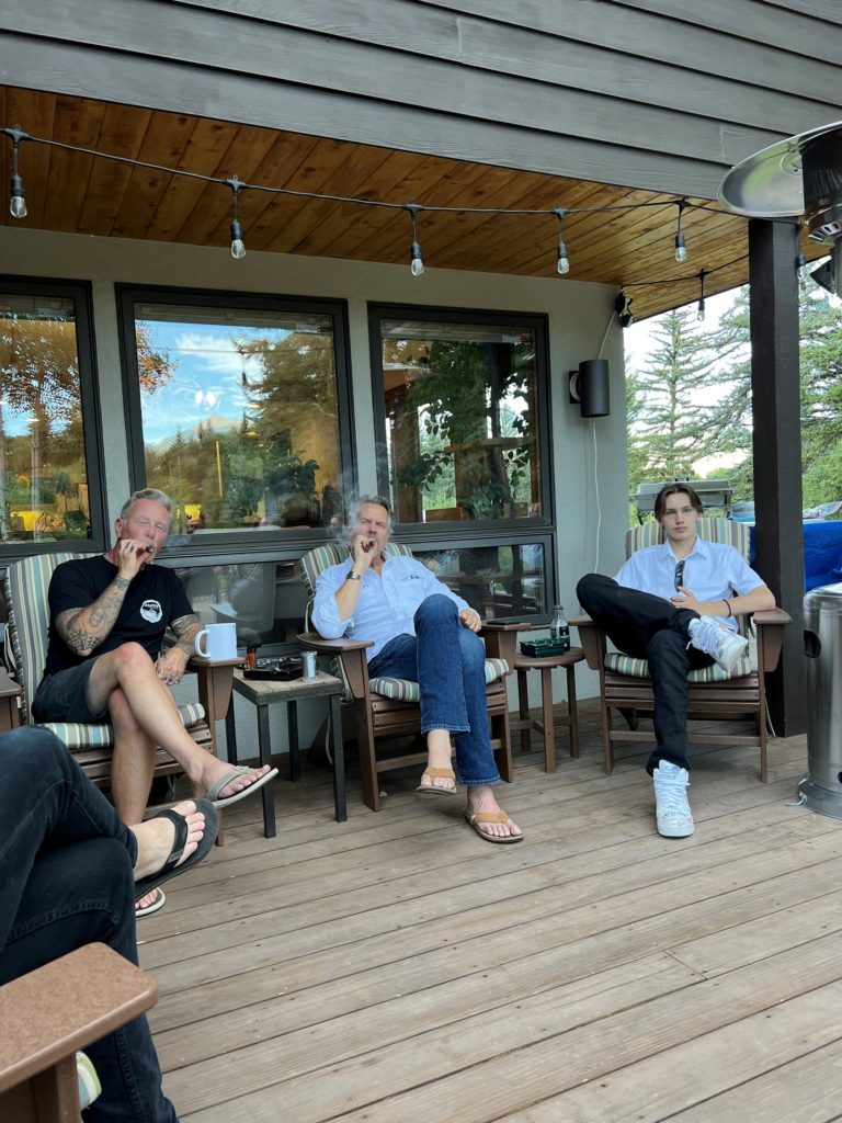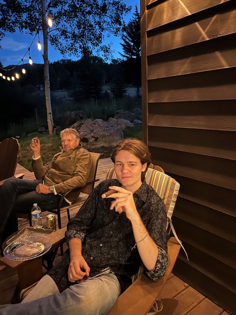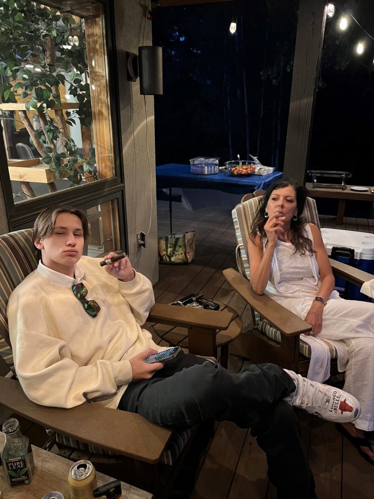 Some fun pics, James, Ty and I, then Ty and our friend Eleni, then a view into the backyard with New York Peak off in the distance. Love Ty’s expression! Then Jag and I later in the evening. Couldn’t get Lori to smoke one, ha!