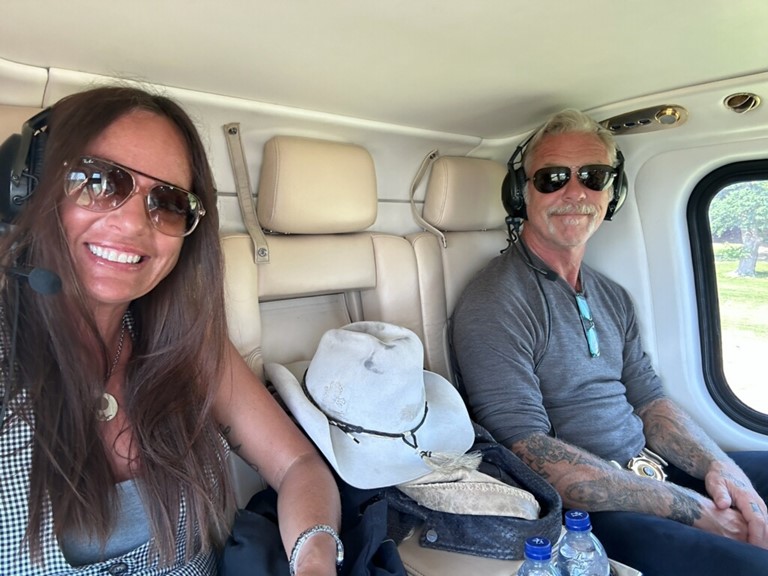Jagger wants to have a pig roast either in Boulder or up here so we’re going to check into what that takes, beside a pig! Big game tomorrow, hope we win. A bunch of us guys are thinking of getting together. James is off to Sweden today for the last stop in this leg of the European tour. He’ll be home a week from tomorrow and needs the break. I think we might go on a leg of the 2024 tour with him between the Munich and Helsinki Finland shows next May since we didn’t make it this year. Here’s a pic they sent yesterday of him and Addy flying in by helicopter to the show in England at Castle Donington. That’s it, have a great Sunday! God Bless.