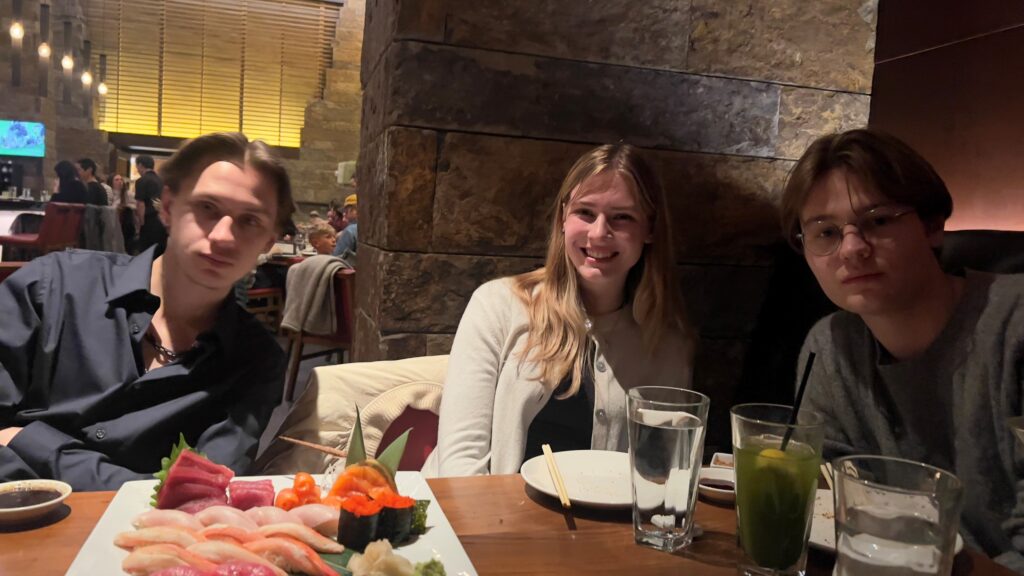 We left for dinner around ten to five and made it to Vail right around 5:30 or so. Lori always asks for the table hidden in the corner which is this little kind of cubby behind the stone fireplace. We’ve obviously known people there for ten years, but the front desk or schedulers always seem to change from season to season. Still, she managed to get us our table. See the kids below. Lori says she’s going to start tickling them, so they smile as they always look so cool when getting their picture taken. At least Ava always smiles! We love her.